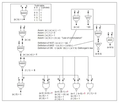 - Emil Post (1921) développe la méthode de table de vérité d'analyse dans son « Introduction à une théorie générale des propositions élémentaires ». Il prend note de la barre de Nicod | .