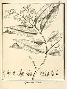 « APOCYNUM (Acouci) foliis oblongo-ovatis, acuminatis; floribus minimis, albis. (TABULA 107.)