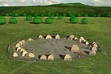 Un village reconstitué de Fort Ancient situé à Dayton, Ohio. De nombreuses fouilles archéologiques ont été effectuées ici dans le parc, ce qui a révélé beaucoup de choses sur le peuple Fort Ancient. |