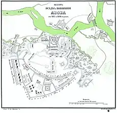 Seules trois tours sur 11 ne sont pas détruites. Les forces de l'Empire ottoman prennent d'assaut la forteresse, mais subissent de lourdes pertes et battent en retraite. Les forces de l'Empire ottoman organisent une attaque massive contre la forteresse. L'armée turque, en infériorité numérique, force les Cosaques à se replier vers la forteresse[5]. Le siège d'Azov prend fin en raison d'un lourd bilan (20 à 70 000 blessés ou tués en trois mois) et de problèmes de soutien de l'armée turque et d'approvisionnement en provisions.