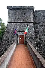 La forteresse se présente comme un puissant édifice de plan carré, entouré de douves profondes, avec quatre grandes tours d'angle rectangulaires. La face extérieure de l'imposante muraille est constituée de pierre provenant de la colline sur laquelle se dresse la forteresse et semble correspondre à une rénovation d'une ancienne forteresse. Comme dans toutes les forteresses de l'époque, on note les rénovations nécessaires à la diffusion des armes à feu à partir du XVIe siècle, avec la démolition des tours médiévales et la création d'espaces pour canonnières et de meurtrières à fusils. L'accès à la cour intérieure se faisait par un pont-levis, remplacé plus tard par un pont en maçonnerie.