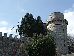 Ce massif bâtiment au plan irrégulier est situé sur une falaise à l'entrée du centre historique et domine toute la vallée environnante. Il ne reste qu'une partie des anciennes murailles crénelées le long de la route, où les merlons gibelins en terre cuite sont clairement visibles. Un peu plus loin, se trouve la célèbre tour semi-circulaire, protagoniste de nombreuses photographies d'époque prises au début du XXe siècle. La partie la mieux conservée est le donjon, situé sur une forte pente. Le noyau résidentiel du château était en lien direct avec la tour susmentionnée. Du côté qui donne sur la place Garibaldi se trouve l'église de la Madonna della Rosa, en partie incorporée dans l'escarpement escarpé.