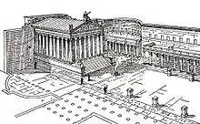 La place est bordée de deux colonnades d'ordre corinthien dont les fûts sont en marbre cipolin et les chapiteaux en marbre blanc de Carrare[20]. Elles supportent un entablement composé d'une architrave à trois bandes et d'une frise au décor végétal[21]. Au-dessus, un haut attique permet aux portiques latéraux de rivaliser avec la hauteur du temple[22]. Le sol des portiques, pavé de marbres colorés, une nouveauté pour un édifice public[23], est plus haut que le niveau de l'esplanade de trois marches. Il est possible que le portique ait eu deux étages comme le laisse penser les traces encore visibles aujourd'hui dans le mur du fond.