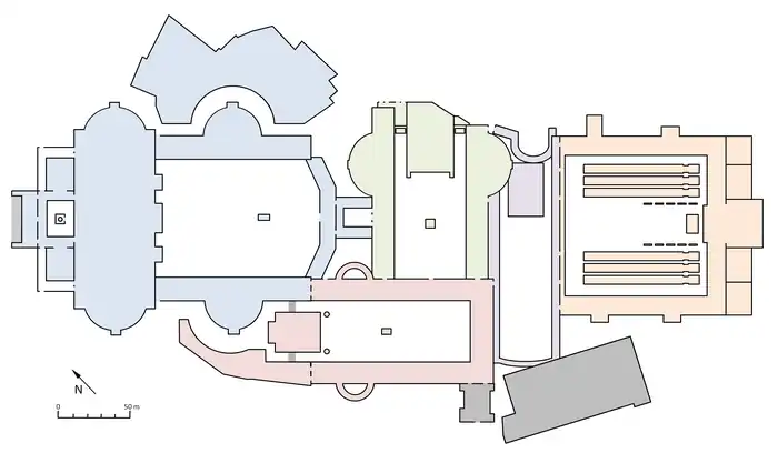 Sa forme est différente. Il s'agit d'un vaste quadrilatère entouré de portiques, le temple étant inséré dans le portique au fond. La zone centrale n'est pas dallée comme une place, mais arrangée en jardins, avec des bassins d'eau et des socles pour statues, le transformant en un véritable musée à ciel ouvert.