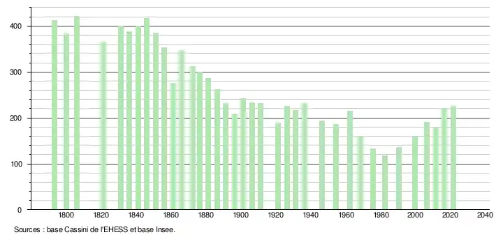 L'évolution du nombre d'habitants est connue à travers les recensements de la population effectués dans la commune depuis 1793. Pour les communes de moins de 10 000 habitants, une enquête de recensement portant sur toute la population est réalisée tous les cinq ans, les populations légales des années intermédiaires étant quant à elles estimées par interpolation ou extrapolation[24]. Pour la commune, le premier recensement exhaustif entrant dans le cadre du nouveau dispositif a été réalisé en 2006[25].