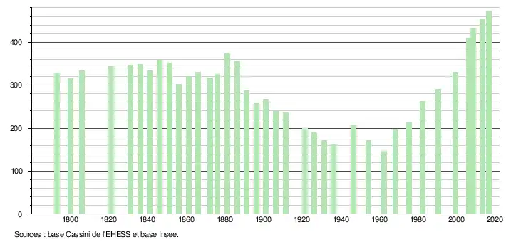 L'évolution du nombre d'habitants est connue à travers les recensements de la population effectués dans la commune depuis 1793. Pour les communes de moins de 10 000 habitants, une enquête de recensement portant sur toute la population est réalisée tous les cinq ans, les populations légales des années intermédiaires étant quant à elles estimées par interpolation ou extrapolation[6]. Pour la commune, le premier recensement exhaustif entrant dans le cadre du nouveau dispositif a été réalisé en 2008[7].