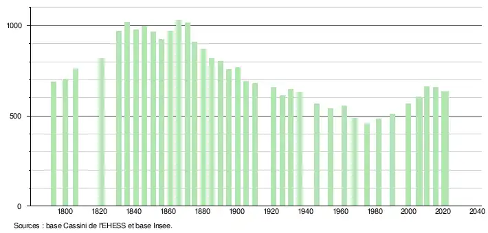L'évolution du nombre d'habitants est connue à travers les recensements de la population effectués dans la commune depuis 1793. Pour les communes de moins de 10 000 habitants, une enquête de recensement portant sur toute la population est réalisée tous les cinq ans, les populations légales des années intermédiaires étant quant à elles estimées par interpolation ou extrapolation[29]. Pour la commune, le premier recensement exhaustif entrant dans le cadre du nouveau dispositif a été réalisé en 2005[30].