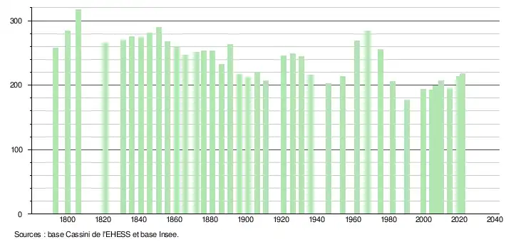 L'évolution du nombre d'habitants est connue à travers les recensements de la population effectués dans la commune depuis 1793. Pour les communes de moins de 10 000 habitants, une enquête de recensement portant sur toute la population est réalisée tous les cinq ans, les populations légales des années intermédiaires étant quant à elles estimées par interpolation ou extrapolation[38]. Pour la commune, le premier recensement exhaustif entrant dans le cadre du nouveau dispositif a été réalisé en 2004[39].