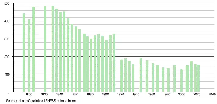 L'évolution du nombre d'habitants est connue à travers les recensements de la population effectués dans la commune depuis 1793. Pour les communes de moins de 10 000 habitants, une enquête de recensement portant sur toute la population est réalisée tous les cinq ans, les populations légales des années intermédiaires étant quant à elles estimées par interpolation ou extrapolation[37]. Pour la commune, le premier recensement exhaustif entrant dans le cadre du nouveau dispositif a été réalisé en 2007[38].