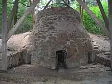 Les four le plus anciennement employé en France consistaient à creuser une cavité circulaire, soit sur une pente de colline, dont on a aplani une place de 10 mètres (30 à 40 pieds) de diamètre, soit sur le sommet également aplani ou coupe d'un tertre. Cette cavité, en forme d'entonnoir évasé, communiquait par un tuyau , adapté à sa partie inférieure, avec une petite chambre voûtée dans le milieu de laquelle se trouvait un récipient. Les choses ainsi arrangées, on plaçait quelques bûches en travers et horizontalement sur l'ouverture au fond de la cavité; on remplissait ensuite toute cette cavité avec des bûchettes ou bûches fendues, ayant 60 cm (2 pieds à 2 pieds 3 pouces) de longueur, en ayant le soin de les poser couchées suivant l'inclinaison des parois; puis sur le dernier rang, au niveau du sol, on élevait une meule analogue à celles à charbon de bois dans les forêts, en amoncelant des bûchettes semblables à celles des rangs inférieurs, mais inclinées en sens inverse. On implantait au 2e rang un poteau dont on entourait le pied de menus débris ligneux très inflammables; puis, on garnissait jusqu'à 4 pouces près du sol tout le monceau de paille, de feuilles ou de gazons retournés ou terre humectée; on enlevait alors le poteau central, on jetait dans l'ouverture qu'il laissait des charbons incandescents, puis on laissait le feu faire quelques progrès avant de boucher, à l'aide d'une plaque ou de gazons, l'ouverture supérieure de la cheminée[2].