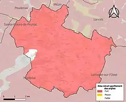 Le retrait-gonflement des sols argileux est susceptible d'engendrer des dommages importants aux bâtiments en cas d’alternance de périodes de sécheresse et de pluie. 98,5 % de la superficie communale est en aléa moyen ou fort (94,5 % au niveau départemental et 48,5 % au niveau national). Sur les 207 bâtiments dénombrés sur la commune en 2019, 205 sont en aléa moyen ou fort, soit 99 %, à comparer aux 93 % au niveau départemental et 54 % au niveau national. Une cartographie de l'exposition du territoire national au retrait gonflement des sols argileux est disponible sur le site du BRGM[19],[Carte 3].