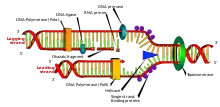 La fourche de réplication est une transformation de la forme de l'ADN. L'ADN prend normalement la forme de deux brins entortillés en double hélice, mais pendant la réplication, cette forme change énormément. En effet, la réplication commence grâce à une ou plusieurs origines de réplication qui sont des séquences de nucléotides spécifiques reconnues par des protéines de réplication. Ces protéines vont s'attacher aux origines de réplication et séparer les deux brins d'ADN ce qui va former un "œil" de réplication. Mais d'autres enzymes interviennent à ce moment-là, les hélicases. Ces enzymes vont se fixer aux extrémités de l’œil de réplication et commencer à dérouler l'ADN et à détacher les deux brins, pour pouvoir augmenter l’œil de réplication. Ce faisant, les hélicases vont transformer les extrémités des yeux de réplication en forme de Y, appelées fourches de réplication.