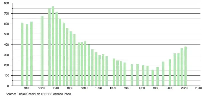 L'évolution du nombre d'habitants est connue à travers les recensements de la population effectués dans la commune depuis 1793. Pour les communes de moins de 10 000 habitants, une enquête de recensement portant sur toute la population est réalisée tous les cinq ans, les populations légales des années intermédiaires étant quant à elles estimées par interpolation ou extrapolation[17]. Pour la commune, le premier recensement exhaustif entrant dans le cadre du nouveau dispositif a été réalisé en 2006[18].
