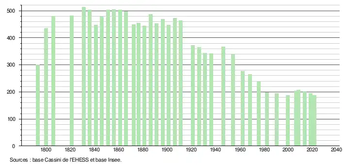 L'évolution du nombre d'habitants est connue à travers les recensements de la population effectués dans la commune depuis 1793. Pour les communes de moins de 10 000 habitants, une enquête de recensement portant sur toute la population est réalisée tous les cinq ans, les populations légales des années intermédiaires étant quant à elles estimées par interpolation ou extrapolation[25]. Pour la commune, le premier recensement exhaustif entrant dans le cadre du nouveau dispositif a été réalisé en 2008[26].