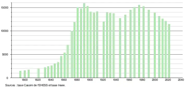 - Par convention dans Wikipédia, le principe a été retenu de n’afficher dans le tableau des recensements et le graphique, pour les populations légales postérieures à 1999, que les populations correspondant à une enquête exhaustive de recensement pour les communes de moins de 10 000 habitants, et que les populations des années 2006, 2011, 2016, etc. pour les communes de plus de 10 000 habitants, ainsi que la dernière population légale publiée par l’Insee pour l'ensemble des communes.