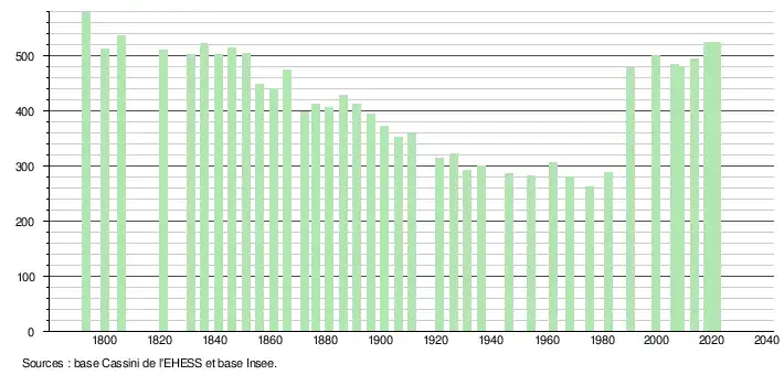 L'évolution du nombre d'habitants est connue à travers les recensements de la population effectués dans la commune depuis 1793. Pour les communes de moins de 10 000 habitants, une enquête de recensement portant sur toute la population est réalisée tous les cinq ans, les populations légales des années intermédiaires étant quant à elles estimées par interpolation ou extrapolation[37]. Pour la commune, le premier recensement exhaustif entrant dans le cadre du nouveau dispositif a été réalisé en 2008[38].