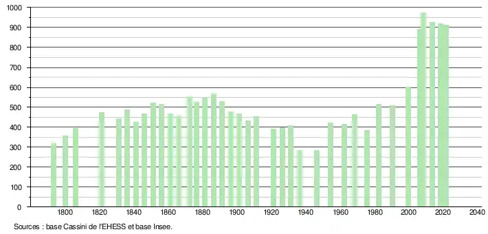 L'évolution du nombre d'habitants est connue à travers les recensements de la population effectués dans la commune depuis 1793. Pour les communes de moins de 10 000 habitants, une enquête de recensement portant sur toute la population est réalisée tous les cinq ans, les populations légales des années intermédiaires étant quant à elles estimées par interpolation ou extrapolation[20]. Pour la commune, le premier recensement exhaustif entrant dans le cadre du nouveau dispositif a été réalisé en 2008[21].