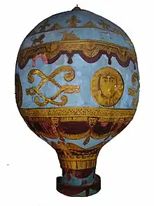 Le , c'est donc à Versailles devant Louis XVI qu'a lieu la démonstration avec un mouton, un canard et un coq comme passagers. Ils furent enfermés dans un panier rond en osier accroché par une corde au ballon[11]. Une fois lâché, celui-ci monta à une hauteur estimée de 500 mètres. Handicapé par une déchirure causée au départ, le ballon vole huit minutes et parcourt trois kilomètres cinq cents.