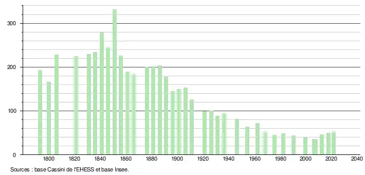 | L'évolution du nombre d'habitants est connue à travers les recensements de la population effectués dans la commune depuis 1793. Pour les communes de moins de 10 000 habitants, une enquête de recensement portant sur toute la population est réalisée tous les cinq ans, les populations légales des années intermédiaires étant quant à elles estimées par interpolation ou extrapolation[27]. Pour la commune, le premier recensement exhaustif entrant dans le cadre du nouveau dispositif a été réalisé en 2007[28]. En 2021, la commune comptait 52 habitants[Note 5], en augmentation de 10,64 % par rapport à 2015 (Hautes-Pyrénées : +1,04 %, France hors Mayotte : +1,84 %). |