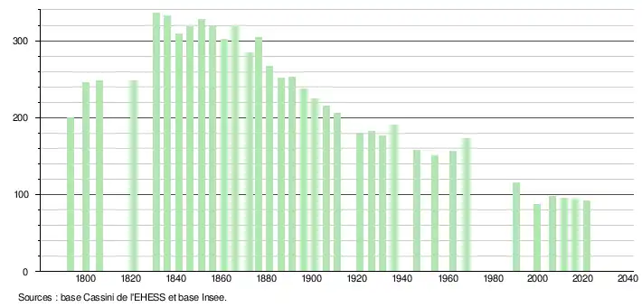 L'évolution du nombre d'habitants est connue à travers les recensements de la population effectués dans la commune depuis 1793. Pour les communes de moins de 10 000 habitants, une enquête de recensement portant sur toute la population est réalisée tous les cinq ans, les populations légales des années intermédiaires étant quant à elles estimées par interpolation ou extrapolation[15]. Pour la commune, le premier recensement exhaustif entrant dans le cadre du nouveau dispositif a été réalisé en 2006[16].