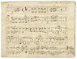 Après son retour à Varsovie, il entend de nouveau Hummel et pour la première fois Paganini au théâtre national l'été suivant. Il se rend à plusieurs des dix concerts que l'italien y donne : il est abasourdi par l'extrême virtuosité. Le 19 juillet un banquet est donné en l'honneur du violoniste et Elsner lui remet une tabatière portant l'inscription : « Au chevalier Niccolò Paganini, les admirateurs de son talent »[102]. Dans la foulée des concerts, Chopin compose une paraphrase assez fade[103] intitulée souvenir de Paganini, publié seulement en 1881[104],[105] et, sous le choc de « cet univers de la virtuosité transcendante »[106] de l'Italien, commence à écrire les premières études de l'opus 10 : les numéros 8 à 11[107]. Les concerts suivants auxquels il assiste, donnés par Heller et Lipiński, ne font que souligner le génie de Paganini[108].