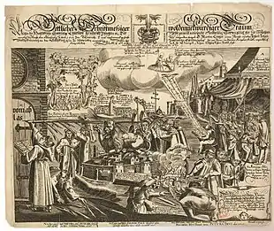 Là-dessus le moine s'y rendit et se mit à écrire : il le fit en si grosses lettres que je pouvais de Schweinitz lire ce qu'il écrivait. La plume dont il se servait était si grande, que l'extrémité atteignait jusqu'à Rome; elle y perçait les oreilles d'un lion qui y était couché, et faisait chanceler sur la tête du Pape la triple couronne. Tous les cardinaux et les princes, accourant en toute hâte, s'efforçaient de la soutenir. Moi-même et vous mon frère, nous voulions aider aussi : j'étendis le bras ; mais en ce moment je me réveillai le bras en l'air, tout épouvanté et fort en colère contre ce moine qui ne savait pas mieux gouverner sa plume. Je me remis un peu… ce n'était qu'un songe. — J'étais encore à moitié endormi, et je fermai de nouveau les yeux.