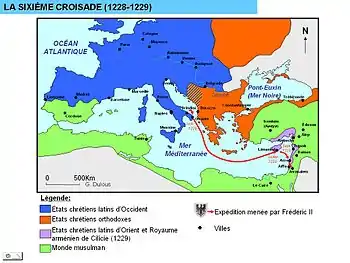 Quelques jours après son arrivée, deux légats du pape débarquèrent dans la même ville et donnèrent l'ordre aux croisés de ne pas obéir à l'empereur excommunié[47]. La chrétienté était divisée entre, d'un côté, les Siciliens, les Allemands, les Teutoniques, les Pisans et les Génois obéissant à l'empereur, et, de l'autre côté, les Anglais, les Français, les Templiers et les Hospitaliers cherchant à contrecarrer ses actions[47]. De plus, les négociations menées avec le sultan Al-Kâmil étaient ardues, la situation politique ayant beaucoup changé depuis le début de la correspondance entre les deux souverains[48]. Pourtant, avec l'aide de l'émir Fahr-ed-Din et du comte Thomas d'Aquin, ils parvinrent à un accord et signèrent en le traité de Jaffa, qui rendait aux chrétiens la ville de Jérusalem[49]. Frédéric fit son entrée dans la ville le et se couronna lui-même roi de Jérusalem le lendemain[50]. Dans le même temps, le pape réaffirmait l'excommunication impériale[51], tandis que le patriarche Gérold jetait l'interdit sur Jérusalem[52].