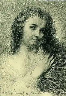 - « La bouche tremble d'un sanglot inapaisé, le cou se gonfle, les narines frémissent, le cou se contracte par l'effet des larmes qui ne peuvent point couler. C'est presque la répétition de la précédente, mais la main ne soutient plus la tête dolente, l'expression est plus passionnée, le cou s'attache avec plus de décision, et les chairs sont traitées avec bien autrement de franchise; c'est la plus belle pièce qu'ait gravée madame O'Connell. La crânerie de l'effet, la sûreté de la pointe font de ce croquis magistral une eau-forte digne des plus illustres Flamands. »