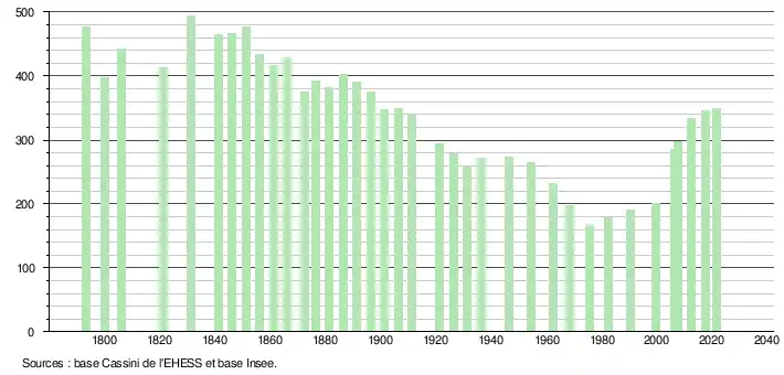 L'évolution du nombre d'habitants est connue à travers les recensements de la population effectués dans la commune depuis 1793. Pour les communes de moins de 10 000 habitants, une enquête de recensement portant sur toute la population est réalisée tous les cinq ans, les populations légales des années intermédiaires étant quant à elles estimées par interpolation ou extrapolation[26]. Pour la commune, le premier recensement exhaustif entrant dans le cadre du nouveau dispositif a été réalisé en 2007[27].