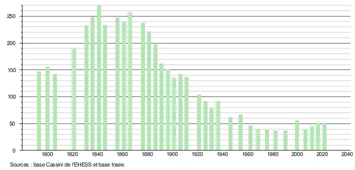 L'évolution du nombre d'habitants est connue à travers les recensements de la population effectués dans la commune depuis 1793. Pour les communes de moins de 10 000 habitants, une enquête de recensement portant sur toute la population est réalisée tous les cinq ans, les populations légales des années intermédiaires étant quant à elles estimées par interpolation ou extrapolation[17]. Pour la commune, le premier recensement exhaustif entrant dans le cadre du nouveau dispositif a été réalisé en 2006[18].