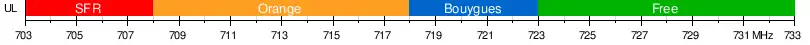 Avec quelques exceptions locales jusqu'au 1er juillet 2015[10] où Bouygues a temporairement conservé 23,8 MHz duplex :
