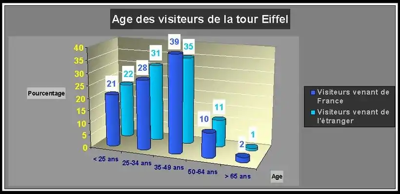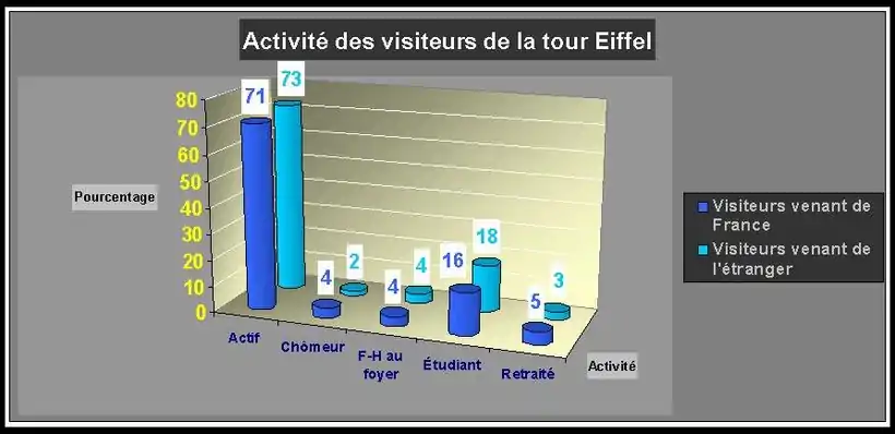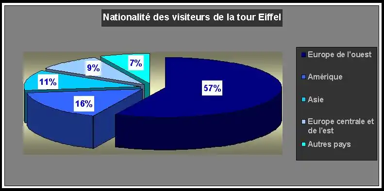 En ce qui concerne la notoriété de la tour Eiffel et le profil de ses visiteurs, la « photographie » présentée ci-dessous résulte d'enquêtes réalisées par TNS Sofres pour le compte de la SNTE (Société nouvelle d'exploitation de la Tour Eiffel), l'exploitant de l'édifice du au .