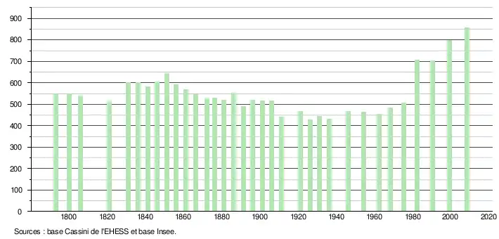 L'évolution du nombre d'habitants est connue à travers les recensements de la population effectués dans la commune depuis 1793. À partir du , les populations légales des communes sont publiées annuellement dans le cadre d'un recensement qui repose désormais sur une collecte d'information annuelle, concernant successivement tous les territoires communaux au cours d'une période de cinq ans. Pour les communes de moins de 10 000 habitants, une enquête de recensement portant sur toute la population est réalisée tous les cinq ans, les populations légales des années intermédiaires étant quant à elles estimées par interpolation ou extrapolation[7]. Pour la commune, le premier recensement exhaustif entrant dans le cadre du nouveau dispositif a été réalisé en 2008[8],[Note 1].
