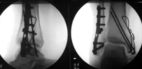 Les complications générales associées au traitement chirurgical des fractures de la cheville comprennent les infections, les saignements, les caillots sanguins, les problèmes de cicatrisation des plaies et les dommages aux nerfs et aux vaisseaux sanguins environnants[2]. Les complications spécifiques associées au traitement chirurgical comprennent la cicatrisation des fractures dans une position anormale (cals vicieux (en)), l'arthrite post-traumatique (en), l'échec de la cicatrisation des fractures après une période de temps prolongée (pas de consolidation osseuse) et une diminution de l'amplitude des mouvements (rigidité postopératoire)[8]. Si les radiographies postopératoires sont préoccupantes pour le cal vicieux, les patients peuvent avoir besoin d'une procédure supplémentaire pour restaurer l'anatomie de la cheville. Le but ultime est de prévenir ou de retarder le développement de l'arthrite post-traumatique[8]. L'arthrite post-traumatique peut initialement être gérée avec des options conservatrices telles que la modification de l'activité, les anti-inflammatoires non stéroïdiens (AINS), les chaussures spécialisées et les injections de cortisone[15]. Si les patients ressentent toujours des douleurs et une altération de la fonction de la cheville après ces mesures, d'autres procédures telles que l'arthrodèse de la cheville (en) et l'arthroplastie de la cheville peuvent être envisagées[16]. La pseudarthrose est rare après une fixation chirurgicale des fractures de la cheville, mais peut être traitée avec des greffes osseuses (en) et une fixation interne stable[16]. Les patients peuvent également ressentir de la douleur ou de l'inconfort à cause du matériel métallique utilisé pour réparer la fracture. En conséquence, certains patients décident de retirer le matériel après la guérison de la fracture grâce à une procédure supplémentaire[2].