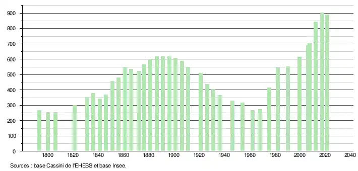 L'évolution du nombre d'habitants est connue à travers les recensements de la population effectués dans la commune depuis 1793. Pour les communes de moins de 10 000 habitants, une enquête de recensement portant sur toute la population est réalisée tous les cinq ans, les populations légales des années intermédiaires étant quant à elles estimées par interpolation ou extrapolation[23]. Pour la commune, le premier recensement exhaustif entrant dans le cadre du nouveau dispositif a été réalisé en 2007[24].