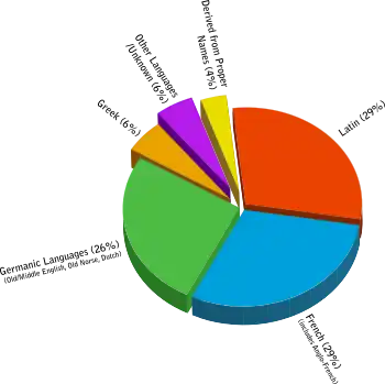 La majorité du fonds lexical français provient du latin (en tant que langue-mère) ou bien est construit à partir des racines gréco-latines. De nombreux termes possèdent un doublon de même étymologie, l'un ayant évolué à travers les siècles à partir du latin populaire tandis que l’autre est emprunté directement au latin classique : métier/ministère, façon/faction, raide/rigide, froid/frigide, frêle/fragile, rançon/rédemption, raison/ration, poison/potion, chance/cadence, etc. Souvent l'invention de mots à partir d'un mot bien français passe par un emprunt à sa forme en latin classique : mère/maternel, frère/fraternel, cheveu/capillaire, foi/fidèle, œil/oculaire, sûr/sécurité, siècle/séculaire, etc. Un changement de paradigme[13] en étymologie romane remplace la méthode traditionnelle fondée sur les données du latin écrit par celle de la méthode comparative, dans le but de rebâtir l'étymologie proto-romane du noyau commun du lexique héréditaire roman, nuançant ainsi l'idée selon laquelle « la majorité du fonds lexical français provient du latin »[Note 1].