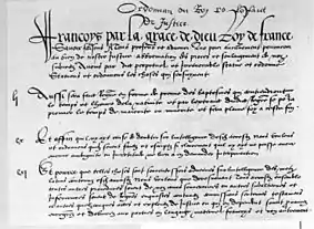 C'est en 1539 que débute officiellement la francisation de la France avec la proclamation de l'ordonnance de Villers-Cotterêts, signée par François Ier : elle impose le français comme langue du droit et de l'administration en France, en remplacement du latin. Cependant[23], il ne faut pas en conclure que tous les Français parlent cette langue : les historiens estiment que 10 % à 20 % de la population parle la langue du roi au XVIe siècle[39]. Bien que l'ordonnance soit relativement longue avec ses 192 articles[40], seuls les articles 110 et 111 concernaient la langue :