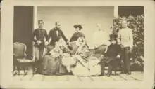 La famille impériale en 1861 : l'archiduc François-Charles assis à côté de sa femme et de sa belle-fille, l'impératrice Elisabeth avec le Kronprinz Rodolphe et l'archiduchesse Gisèle. Debout, l'empereur, l'archiduc « Max » et sa femme, les archiducs Louis-Victor et Charles-Louis.