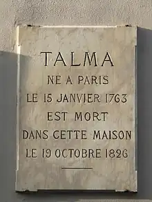 Un an avant sa mort, Talma a rédigé sa vision révolutionnaire du théâtre dans son Mémoire sur Lekain et sur l'art dramatique. À sa mort, au 9 rue de la Tour-des-Dames, Paris tout entier a assisté à son inhumation, sans cérémonie religieuse, au Père-Lachaise[n 2], le .