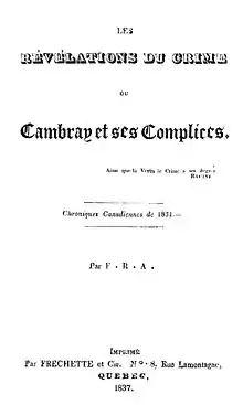 - François-Réal Angers. Les Révélations du crime ou Cambray et ses complices : chroniques canadiennes de 1834. Québec : imprimé par Fréchette et cie, 1837.