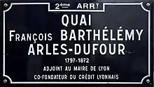 Un quai de Lyon, dans le quartier de la Confluence[37], et une place d'Oullins portent son nom. Il existait, avant l'indépendance, une rue Arlès-Dufour à Alger.