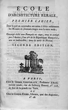 - Architecture périodique, ou notice des travaux et approvisionnemens que chacun peut faire, a peu de frais, chaque mois et chaque année, soit pour améliorer ses fonds, soit pour construire toutes sortes de batisses, soit pour multiplier les engrais. Paris : Bureau de l'école d'architecture rurale, 1792. (Lire en ligne)