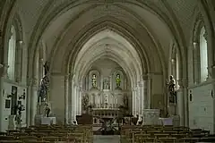 - Église Saint-Étienne, Saint-Étienne-l'Allier, Vierge à l'Enfant, Litanies de la Vierge[47], Saint Benoît et Sain Expédit, Saint Maurice et Saint Emma, Petite rose chantant "Marie, reine du ciel et reine de France", 5 vitraux, 1939[3] ;