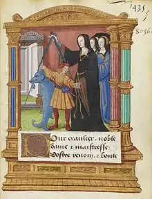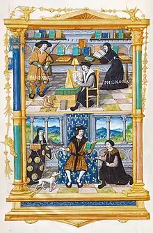 Enluminure de dédicace dans L'Institution du prince, vers 1518-1519, Paris, Bibliothèque de l'Arsenal, Ms. 5103, fo 1 vo. Destinataire du traité précité, le jeune François Ier consulte l'ouvrage. Entouré par Mercure et l'incarnation de la philologie, Guillaume Budé figure à sa table de travail.