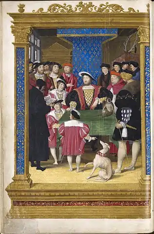 Noël Bellemare et François Clouet, François Ier, entouré de sa cour, reçoit un ouvrage de son auteur.