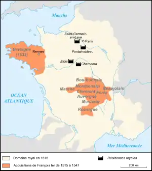 Sur le plan intérieur, son règne coïncide avec l'accélération de la diffusion des idées de la Réforme. La constitution de ce qui deviendra sous les Bourbons la monarchie absolue et les besoins financiers liés à la guerre et au développement des arts induisent la nécessité de contrôler et optimiser la gestion de l'État et du territoire. François Ier introduit une série de réformes touchant à l'administration du pouvoir et en particulier à l'amélioration du rendement de l'impôt, réformes mises en œuvre et poursuivies sous le règne de son fils et successeur, Henri II.