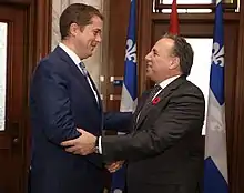 François Legault (/fʁã.swa lə.ɡo/[note 2]), né le à Montréal (Québec)[note 1], est un comptable, homme d’affaires et homme politique québécois. Fondateur et chef de la Coalition avenir Québec, il est le premier ministre du Québec depuis le .