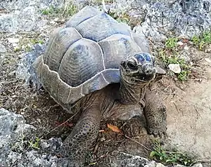 La tortue d’Aldabra est une espèce qui a été importée de l’atoll d’Aldabra, une dépendance des Seychelles vers Maurice dans les années 1880, à la suite des recommandations de Charles Darwin. Lorsqu’il s’est rendu compte que les tortues avaient été décimées à Maurice et à Rodrigues, il a demandé au gouverneur d’alors de permettre l’élevage de tortues d’Aldabra. Ce sont elles qui ont ensuite été disséminées à travers l’île. Le choix de l’Aldabra n’est pas fortuit. De par sa taille (la carapace mesure en moyenne 1,20 m de long) et son poids (jusqu’à près de 300 kilos pour les plus lourdes), cette race ressemble à la tortue Cylindraspis, qui se trouvait à l’origine à Rodrigues et qui a aujourd’hui complètement disparu.