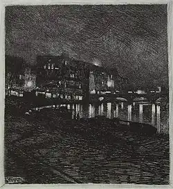 Les Quais, le soir de 1906 est une des gravures de Liège qui illustre le contrôle du clair-obscur dont François Maréchal est capable[18].