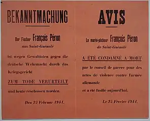 Affiche allemande annonçant la condamnation à mort de François Péron () (fac-similé du musée de l'Ordre de la Libération, Paris)